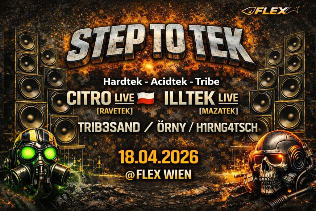 STEP TO TEK w/ CITRO Live [Ravetek] , ILLTEK Live [Mazatek] & Many More FLEX Wien 18.04.2026 Die nächste Runde STEP TO TEK steht an – härter, schneller, kompromissloser. Freut euch auf eine Nacht voller treibender Beats, düsterer Vibes und purem Rave-Energy-Overload im legendären FLEX. LINE UP CITRO Live [Ravetek] ILLTEK Live [Mazatek] TRIB3SAND ÖRNY H1RNG4TSCH Bereit für eine Nacht ohne Grenzen? Wir bringen euch feinsten Tekno & Rave Sound direkt auf die Tanzfläche. Keine Kompromisse – nur Druck nach vorne. ENTRY12€ (Cash Only) IMPORTANT• Early come = more rave• Respect each other – no hate, no limits, just music• Stay hydrated & lose yourself in the sound STEP TO TEK – WHERE THE RAVE NEVER STOPS
